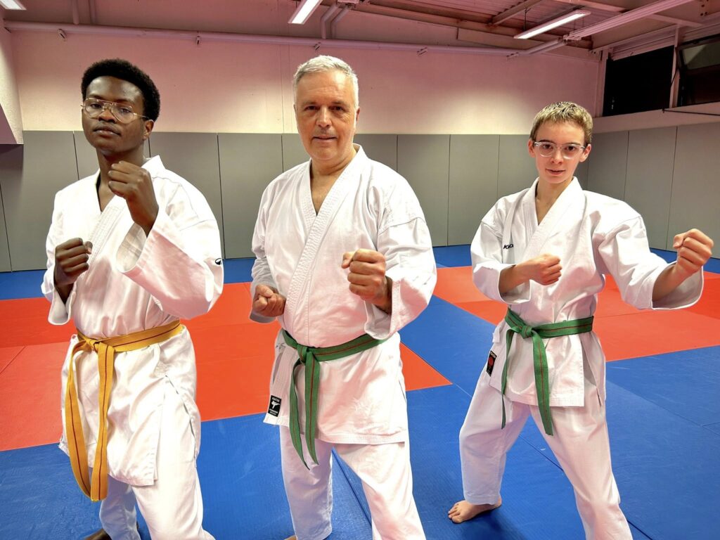 Franck ceinture jaune, Emma ceinture orange, Rihabe ceinture verte/bleue,